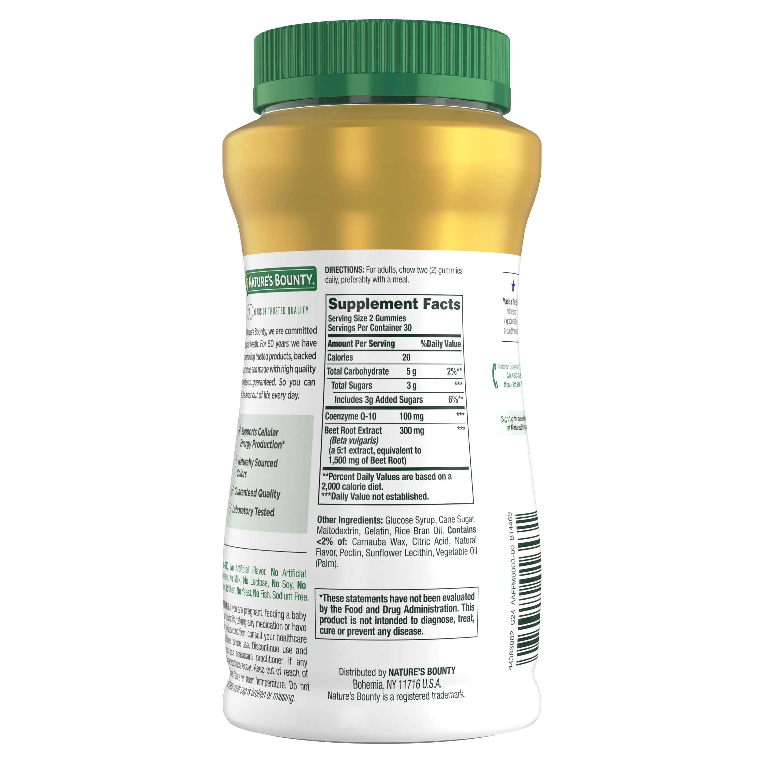 Nature’s Bounty® Beets & CoQ10 Gummies combine Beet Root Extract with the benefits of CoQ10 to support heart health and promote cellular energy production.* supports antioxidant health and plays a key role in cellular energy, cardiovascular function and circulation, while Beet Root Extract is popular for its naturally occurring nitrates.* You’ll enjoy adding these convenient, delicious raspberry-flavored gummies to your wellness routine.