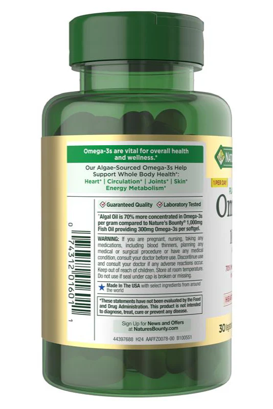 (2) Supportive but not conclusive research shows that consumption of EPA and DHA Omega-3 Fatty Acids may reduce the risk of coronary heart disease. One serving of Nature’s Bounty Algae Oil provides 520mg total of EPA, DHA and other Omega-3 Fatty Acids.