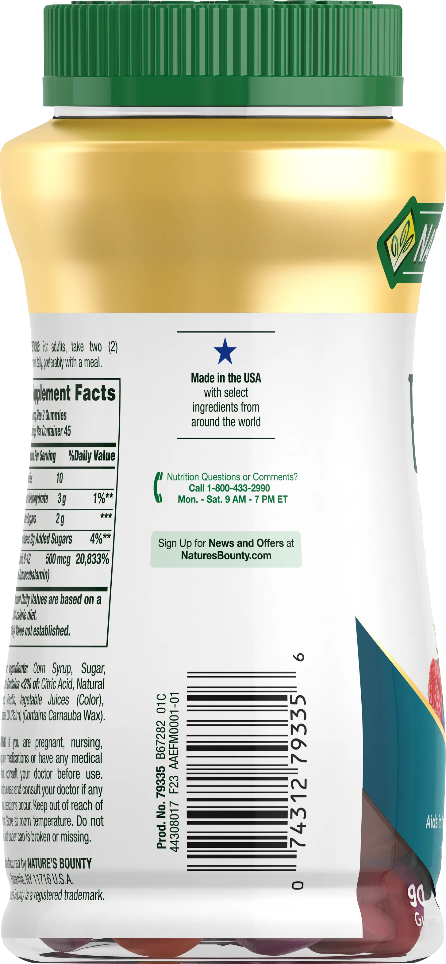 Take Nature’s bounty B-12 Gummies to provide nourishment for the occasional stress of daily living!* Nature’s Bounty B12 Gummies support energy metabolism by aiding in the conversion of food into energy.* Containing 500 mcg of B-12 per serving, these delicious raspberry, mixed berry, and orange flavored gummies are non-GMO and free of artificial flavor. Just chew two delicious gummies daily and your body/taste buds will thank you!